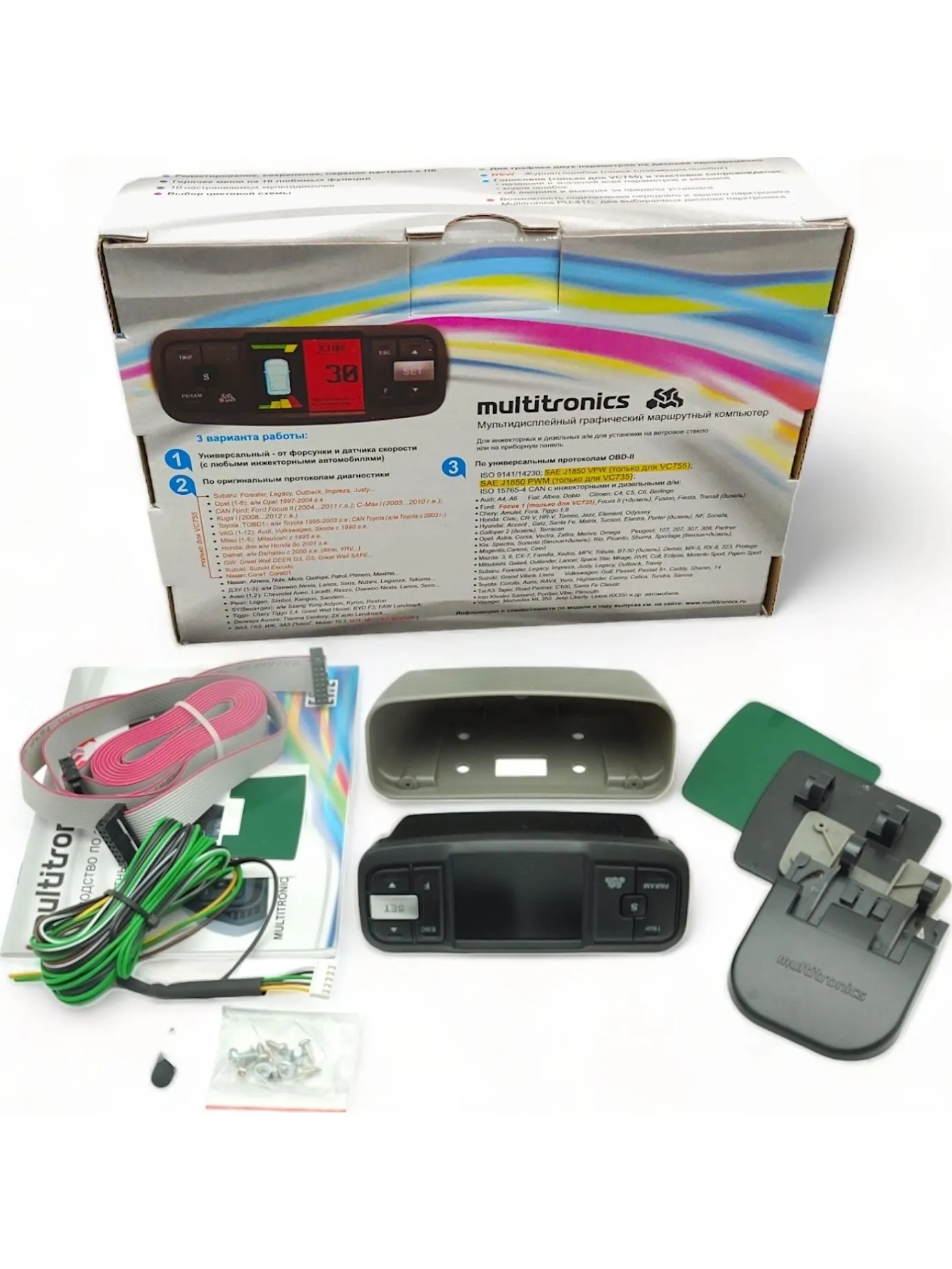 Сборочный комплект Multitronics VС735 : 1. Multitronics VС735 1 шт. 2. Набор пластиковых изделий для универсального крепления в любую а/м универсальный кожух 1 шт. пластина крепления универсального кожуха 1 шт. основание универсального поворотного кронштейна 1 шт. держатель универсального поворотного кронштейна с липкой лентой 1 шт. крышка универсального поворотного кронштейна 1 шт. кронштейн крепления на “торпедо” с липучкой 1 шт. 3. Соединительный шлейф -(длина шлейфа 3,0 м.). 1 шт. 4. Разъем-переходник для подключения к разъему OBD-2 1 шт. 5. Кабель-переходник для подключения опциональных цепей 1 шт. Датчик внешней температуры - черный (длина провода 3 м.) ДУТ- зеленый (длина провода 3,5 м.) Габариты- коричневый (длина провода 2,0 м.) Зажигание - желтый (длина провода 1,0 м.) 6. Комплект метизов и резистор 5,1 кОм (для протоколов Consult1, Consult1D) 1 шт. 7. Краткое руководство по эксплуатации 1 шт. 8. Руководство по подключению 1 шт. 9. Гарантийный талон 1 шт. 10. Упаковочная коробка 1 шт.